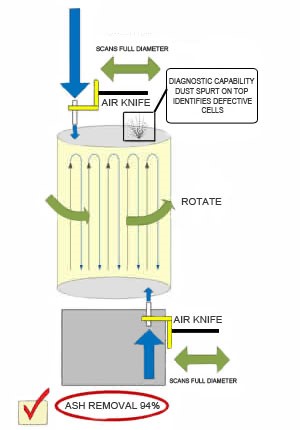 Le but de l’entretien est de déloger les cendres accumulées dans les cellules du filtre à particules. La technologie de nettoyage développée et brevetée par l’entreprise américaine FSX inc. est à ce jour la plus efficace et la plus reconnue sur le marché. Cette technologie utilise 2 étapes de nettoyage soit : pneumatique (Phase 1) et thermique (Phase 2).
